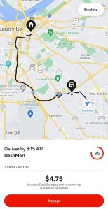 In the image above, you’ll notice this is a Doordash affiliate. Remember what I said about no tip no trip? This certainly applies. Doordash needs to do a better job of raising its base pay to supplement customers who refuse or tip low. It is not a wise decision to drive 10 miles and wait for an order to become ready for $4.75.