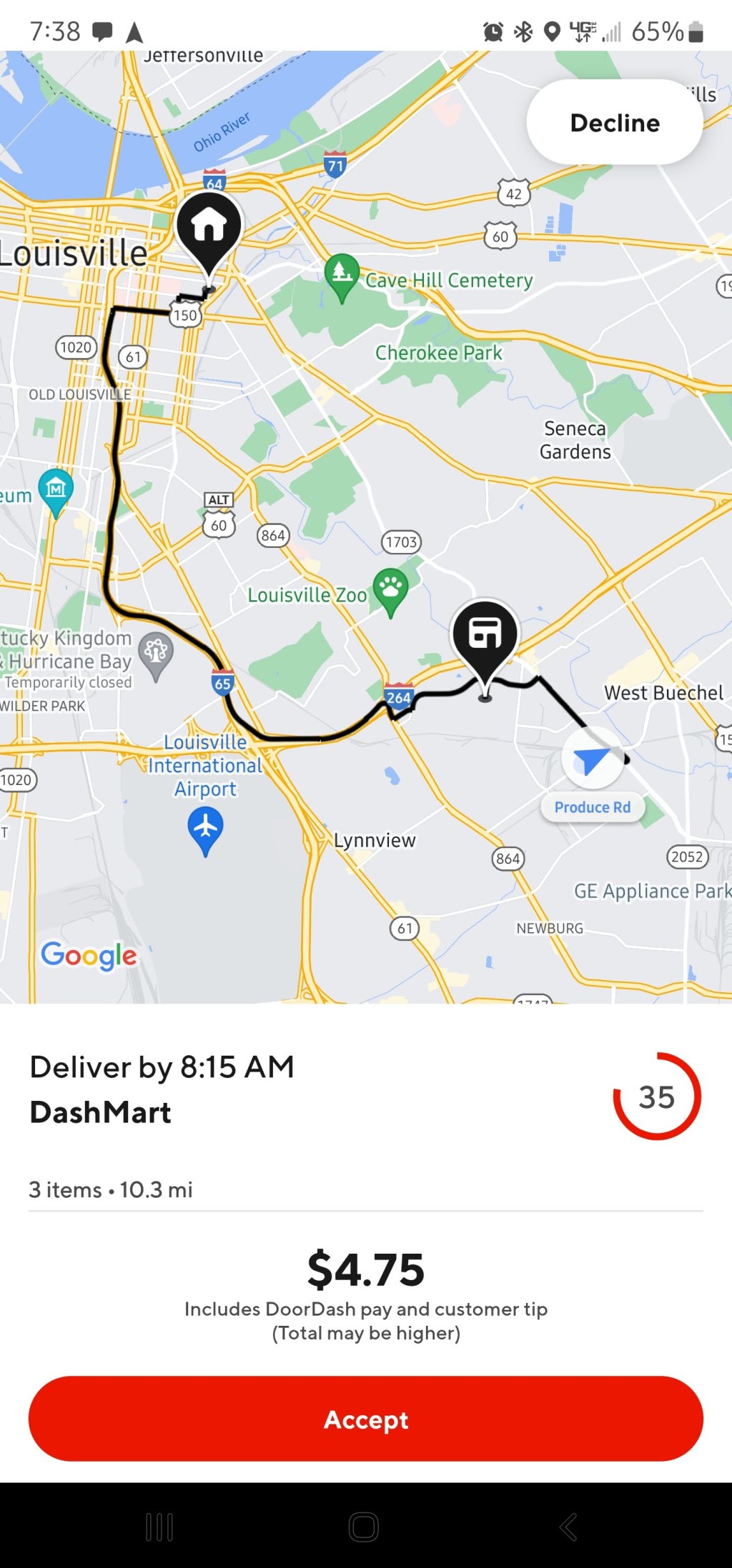 In the above photo, you can see this order was 13 miles for $5.75. You also see below the dollar amount that that amount “includes DoorDash pay and customer tip.” This makes no logical sense to accept if I am trying to maximize profit from DoorDash as my main hustle. Only accept wise orders.