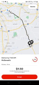 Keep in mind, Dashers are literally mobile bartenders. We make $2 per order. To put this into perspective I’ll give you an honest time scenario. McDonald’s received a customer order and sent it to the Dasher App for $3.25 with an estimated 7.2 miles driven.