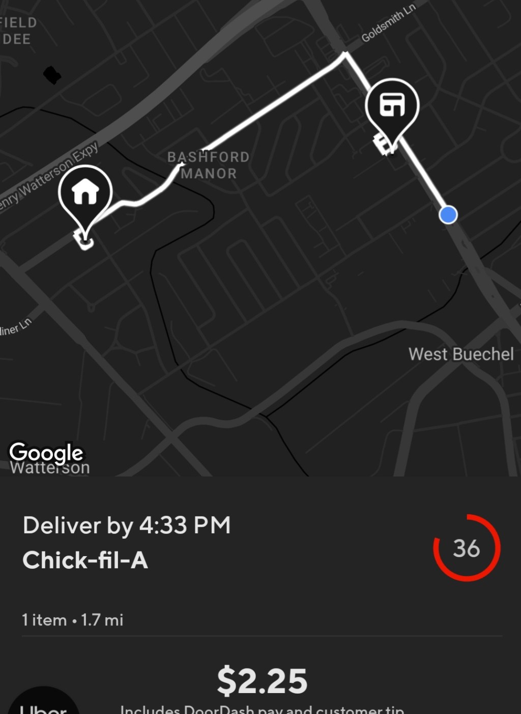 In the above screenshot, this order is from Chick-fil-A where the total pay is $2.25 for 1.7 mi.