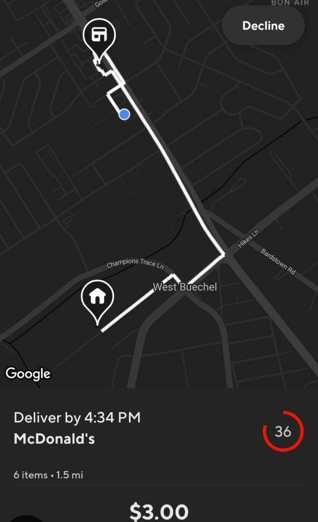 Orders that I typically decline are ones that don’t equal a dollar per mile. Also, orders where the Total Mileage exceeds the Total Pay. Even if I were to accept a job that pays a dollar per mile, I feel like I’m losing money because I’m technically not receiving any additional pay for the convenience of delivery.